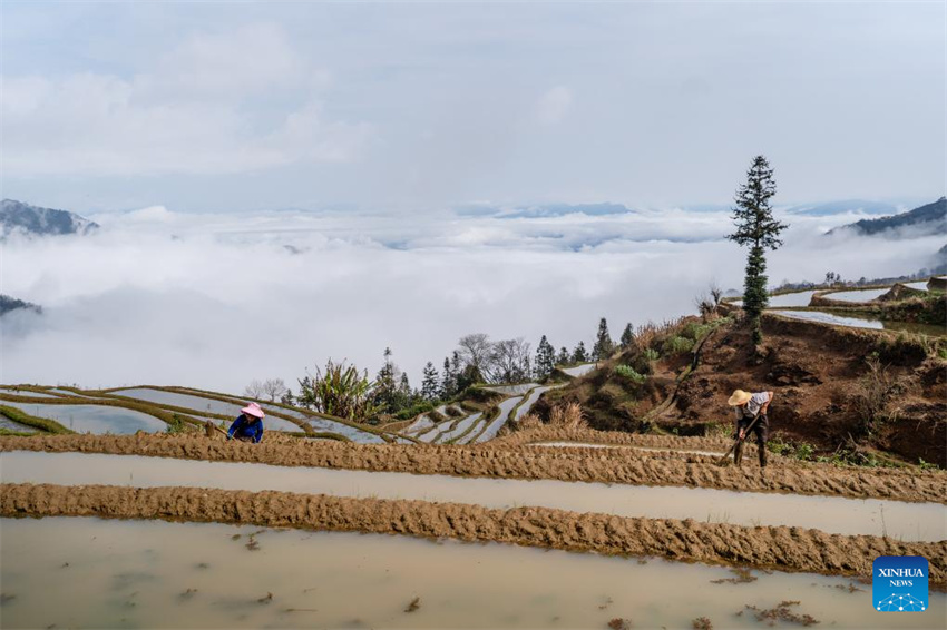 Los aldeanos mantienen las crestas de los campos en terrazas en la aldea de Azheke del distrito de Yuanyang de la prefectura autónoma de las etnias hani e yi de Honghe, provincia suroccidental china de Yunnan, el 26 de febrero de 2025. (Xinhua/Wang Anhaowei.)