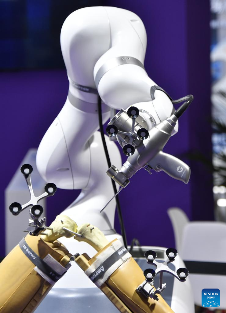 Un robot inteligente para cirugía ortopédica hace una demostración durante la 27.ª Exposición Internacional de Alta Tecnología de Beijing, el 8 de mayo de 2025. (Xinhua/Li Xin.)