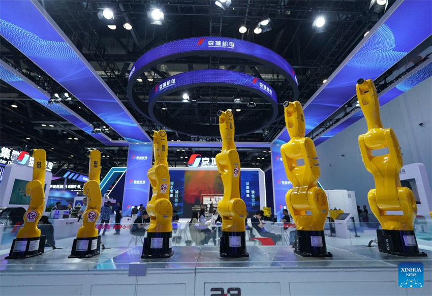 Robots industriales expuestos durante la 27.ª Exposición Internacional de Alta Tecnología de Beijing, el 8 de mayo de 2025. (Xinhua/Zhang Chenlin.)
