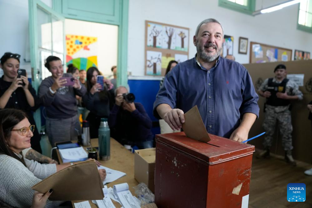 El candidato a intendente de Montevideo por el partido oficialista Frente Amplio, Mario Bergara (d-frente), emite su voto en un circuito de votación durante las elecciones departamentales y municipales, en Montevideo, capital de Uruguay, el 11 de mayo de 2025. Las elecciones departamentales en Uruguay transcurren el domingo con normalidad para elegir a los 19 intendentes de los departamentos en los que se divide el país sudamericano y que gobernarán para el período 2025-2030, divulgó la Corte Electoral. (Xinhua/Nicolás Celaya)