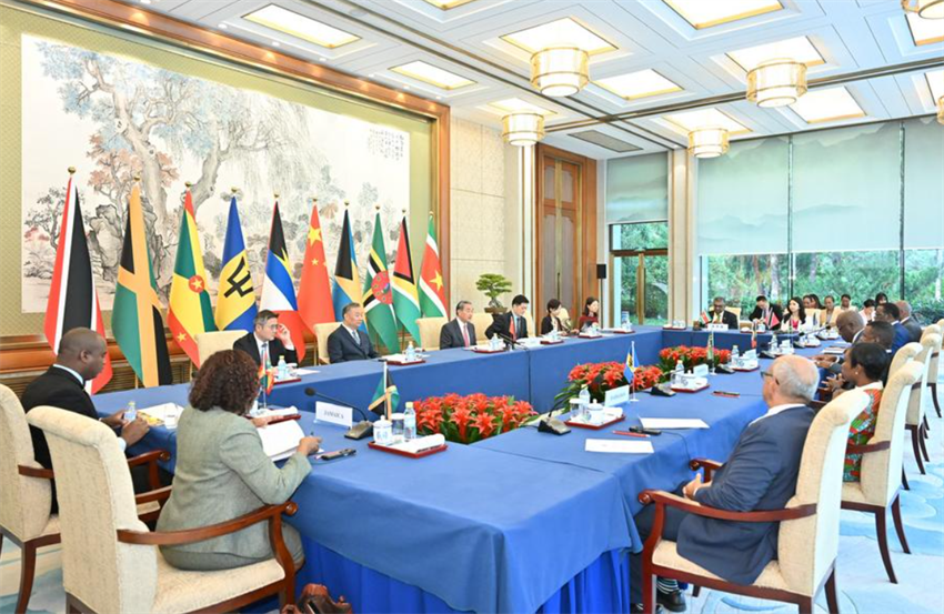 El ministro de Relaciones Exteriores chino, Wang Yi, también miembro del Buró Político del Comité Central del Partido Comunista de China, se reúne con ministros de Relaciones Exteriores y representantes de los países caribeños que tienen relaciones diplomáticas con China, quienes se encuentran aquí para asistir a la cuarta reunión ministerial del Foro China-CELAC (Comunidad de Estados Latinoamericanos y Caribeños), en Beijing, capital de China, el 12 de mayo de 2025. (Xinhua/Yue Yuewei)