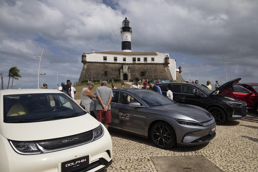 Visitantes observan vehículos eléctricos de la marca BYD en Salvador, capital de Bahía, Brasil, el 4 de julio de 2023. (Xinhua/Wang Tiancong.)