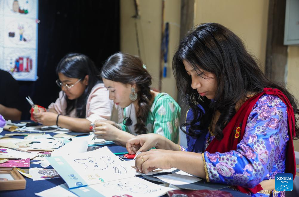 Visitantes extranjeros experimentan el collage de tejidos en la Semana de la Moda de Puyuan, en la localidad de Puyuan de la ciudad de Tongxiang de Jiaxing, provincia oriental china de Zhejiang, el 12 de mayo de 2025. (Xinhua/Xu Yu.)