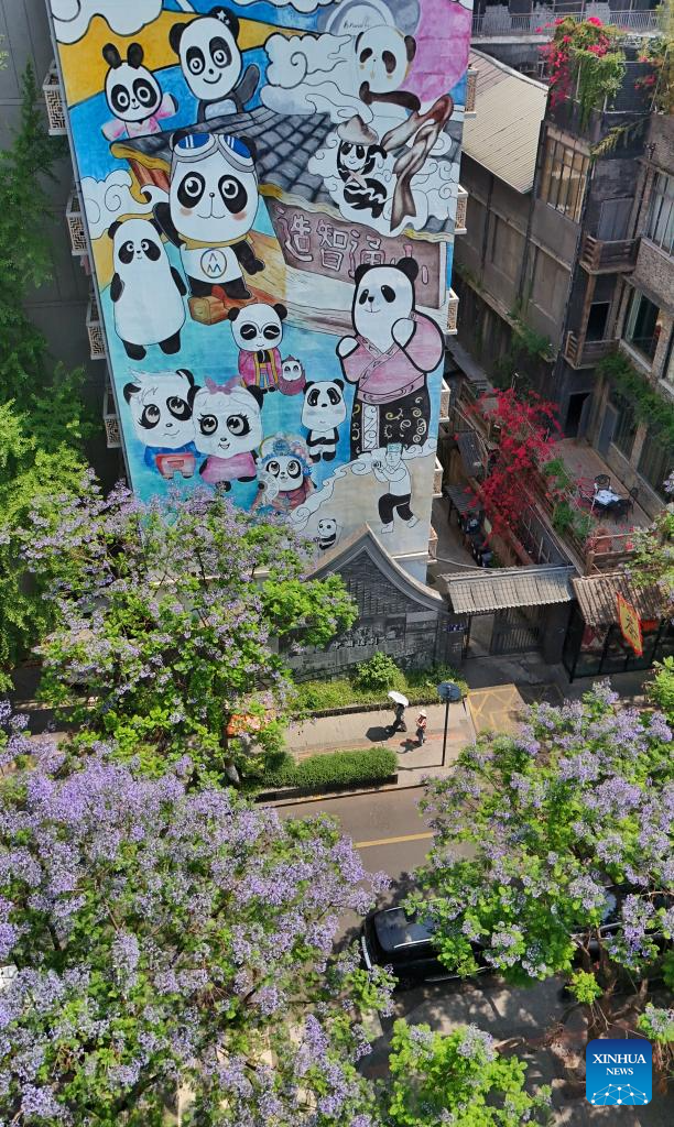 Una foto aérea tomada por un dron el 12 de mayo de 2025 muestra árboles de jacaranda en plena floración a lo largo de la calle Xiaotong en el distrito Qingyang de Chengdu, provincia suroccidental china de Sichuan, el 12 de mayo de 2025. (Xinhua/Liu Kun.)