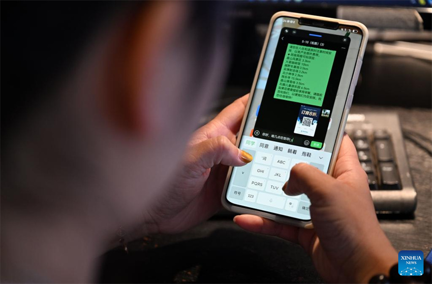 Wang Ruonan pregunta por la hora de la cena a un huésped en una casa de estancia en familia con temática para fotografías vistiendo trajes tradicionales en el distrito de Jizhou, en la ciudad septentrional china de Tianjin, el 10 de mayo de 2025. (Xinhua/Zhao Zishuo.)