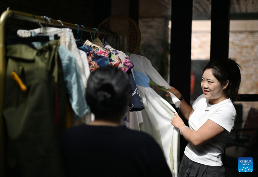 Wang Ruonan (dcha.) recomienda atuendos tradicionales a una invitada en una casa de estancia en familia con temática para fotografías vistiendo trajes tradicionales en el distrito de Jizhou, en Tianjin, norte de China, el 10 de mayo de 2025. (Xinhua/Zhao Zishuo.)