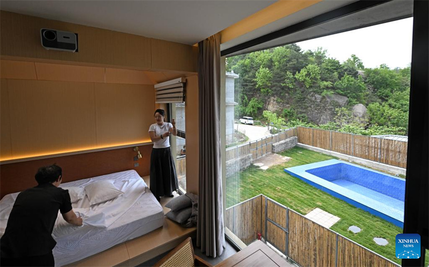 Wang Ruonan (dcha.) conversa con un empleado en una casa de estancia en familia con temática para fotografías vistiendo trajes tradicionales en el distrito de Jizhou, en la ciudad septentrional china de Tianjin, el 10 de mayo de 2025. (Xinhua/Zhao Zishuo.)