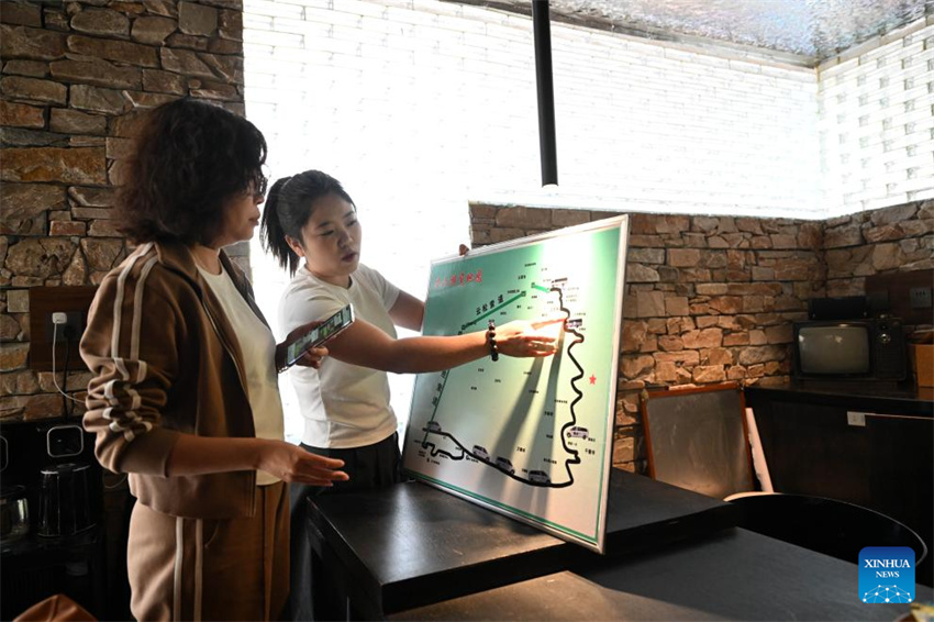 Wang Ruonan (dcha.) presenta la ruta turística de la zona a una huésped en una casa de estancia en familia con temática para fotografías vistiendo trajes tradicionales en el distrito de Jizhou, Tianjin, en el norte de China, el 10 de mayo de 2025. (Xinhua/Zhao Zishuo.)