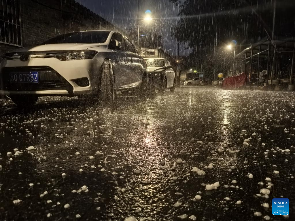 Imagen del 13 de mayo de 2025 de los granizos en el distrito de Xicheng, en Beijing, capital de China. Partes de Beijing atestiguaron fuertes vientos y tormentas eléctricas el martes. (Xinhua/Li He)