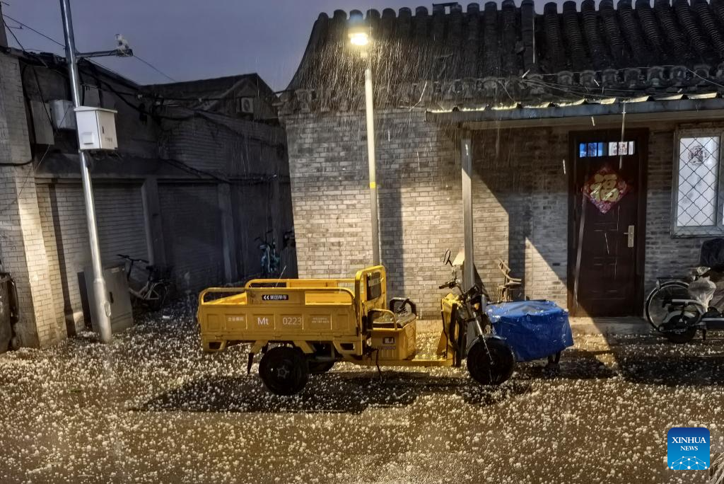 Imagen del 13 de mayo de 2025 de los granizos en el distrito de Xicheng, en Beijing, capital de China. Partes de Beijing atestiguaron fuertes vientos y tormentas eléctricas el martes. (Xinhua/Li He)
