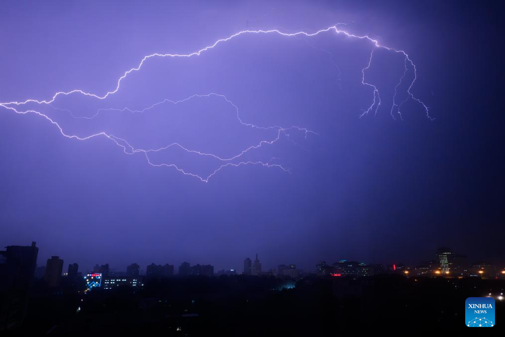Rayos aparecen en el cielo durante una tormenta eléctrica, en el distrito de Haidian, en Beijing, capital de China, el 13 de mayo de 2025. Partes de Beijing atestiguaron fuertes vientos y tormentas eléctricas el martes. (Xinhua/Hu Jingwen)
