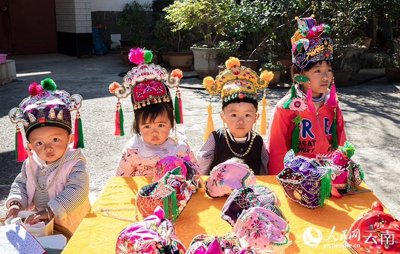 Unos niños llevan sombreros tradicionales con motivos de cabezas de tigre en la ciudad de Diannan, distrito de Heqing, provincia suroccidental china de Yunnan. (Foto/Jiang Ze.)