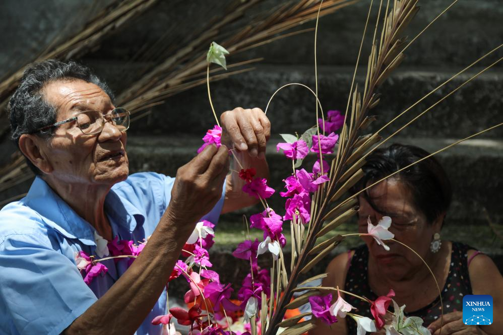 Imagen del 11 de mayo de 2025 de personas adornando una palma de coco con flores durante la celebración del XLIII Festival Cultural de las Flores y Palmas del municipio de Panchimalco, en el departamento de San Salvador, capital de El Salvador. (Xinhua/Alexander Peña)