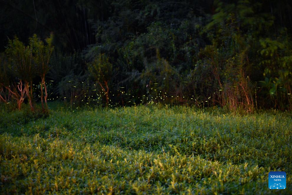 Esta foto, tomada el 13 de mayo de 2025, muestra luciérnagas en el parque Tianhe de Guangzhou, provincia meridional china de Guangdong. La actividad de las luciérnagas atrae a la gente a observarlas y tomar fotos. (Xinhua/Xiao Ennan.)