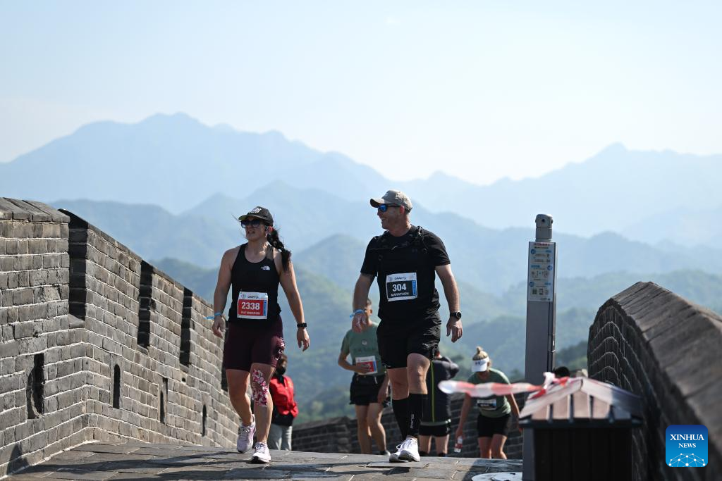 Participantes compiten durante el Maratón de la Gran Muralla, en Tianjin, en el norte de China, el 17 de mayo de 2025. (Xinhua/Li Ran)