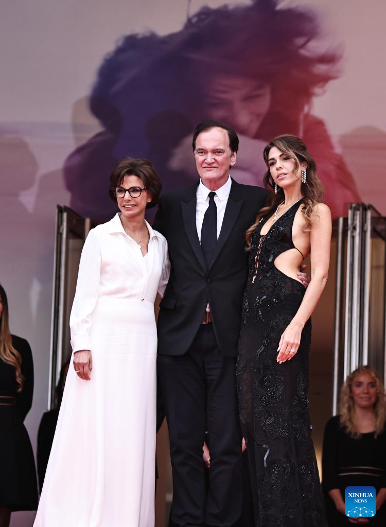 La ministra francesa de Cultura, Rachida Dati, el director de cine estadounidense Quentin Tarantino y su esposa Daniella Pick (de izq. a dcha.) llegan para la proyección de la película «Nouvelle Vague» (Nueva Ola) en la 78 edición del Festival de Cine de Cannes, sur de Francia, el 17 de mayo de 2025. (Xinhua/Gao Jing.)