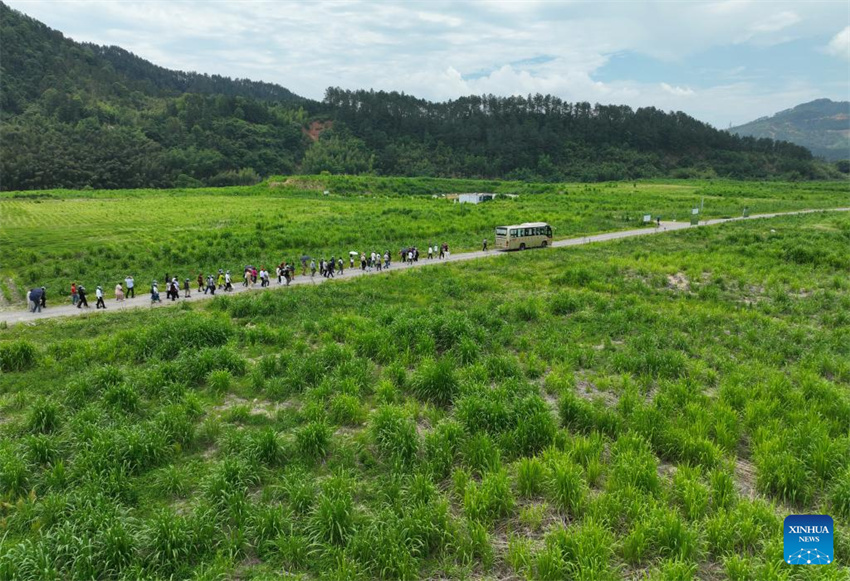 Una foto aérea tomada por un dron el 17 de mayo de 2025 muestra a los invitados visitando una base de juncao en el distrito de Yongtai, Fuzhou, provincia suroriental china de Fujian. (Xinhua/Lin Shanchuan.)