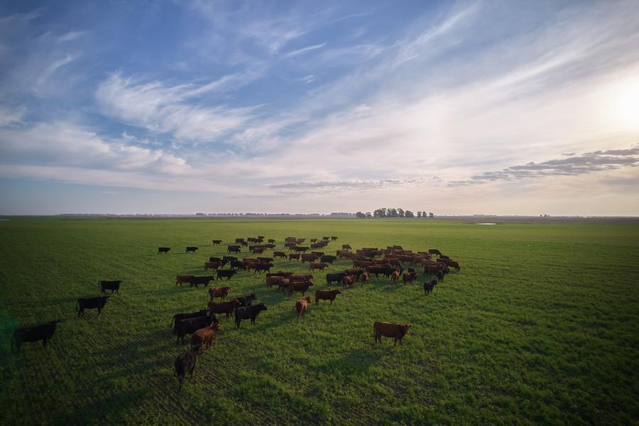 Vista aérea tomada con un dron del 14 de mayo de 2025 de bueyes en la Estepa Pampeana, Argentina. (Xinhua/Meng Dingbo)