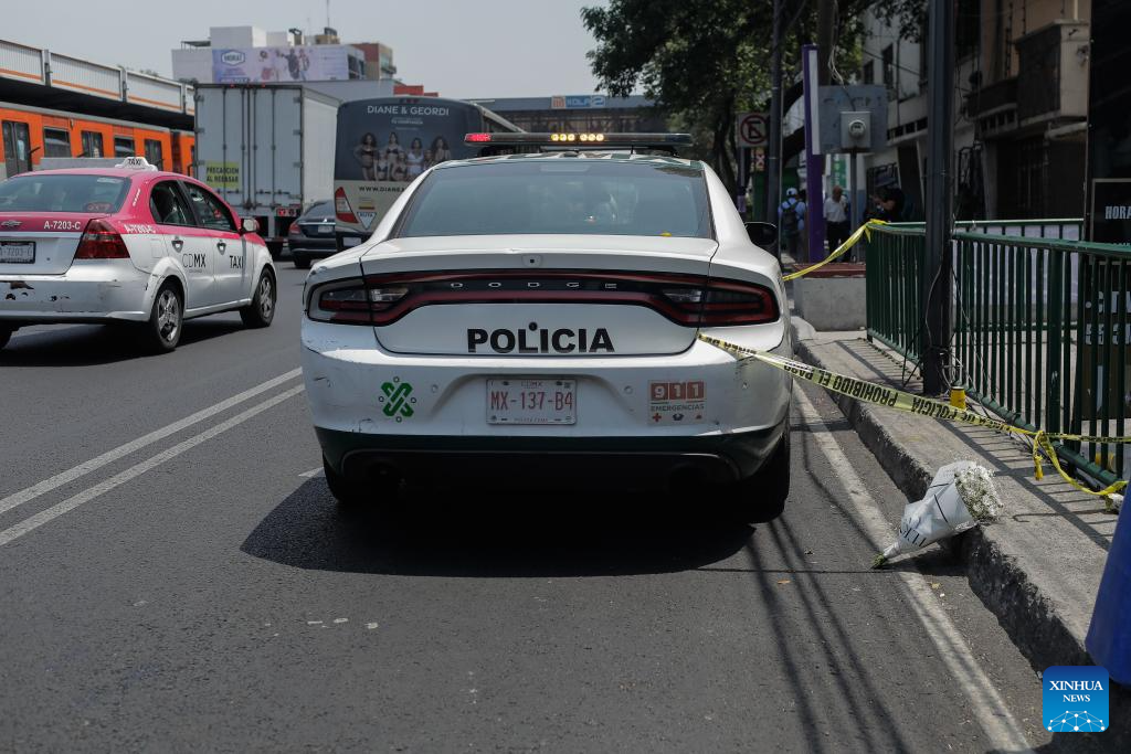 Una patrulla de la policía resguarda el sitio de un ataque contra Ximena Guzmán, secretaria particular de la jefa de Gobierno de la Ciudad de México, Clara Brugada, en la Ciudad de México, capital de México, el 20 de mayo de 2025. En un ataque directo fueron asesinados la mañana del martes dos colaboradores cercanos de la jefa de Gobierno de la Ciudad de México, Clara Brugada: su secretaria particular, Ximena Guzmán, y su asesor, José Muñoz. (Xinhua/Str)
