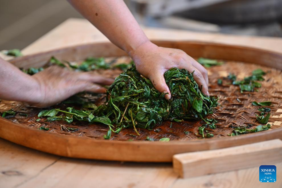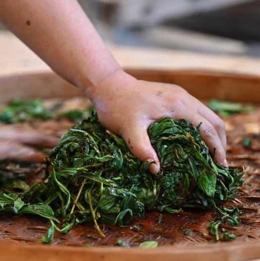 Imagen del 7 de mayo de 2025 de You Yuqiong, una heredera de la técnica de elaboración del té de roca Wuyi, amasando hojas de té, en Wuyishan, en la provincia de Fujian, en el sureste de China. Wuyishan, una importante base productora de té en China, es el hogar del famoso té de roca Wuyi, un tipo de té oolong. Su técnica de elaboración del té fue declarada patrimonio cultural inmaterial nacional en 2006 y forma parte de las "técnicas tradicionales de elaboración del té y prácticas sociales asociadas en China" inscritas en 2022 como patrimonio cultural inmaterial de la UNESCO. (Xinhua/Jiang Kehong)
