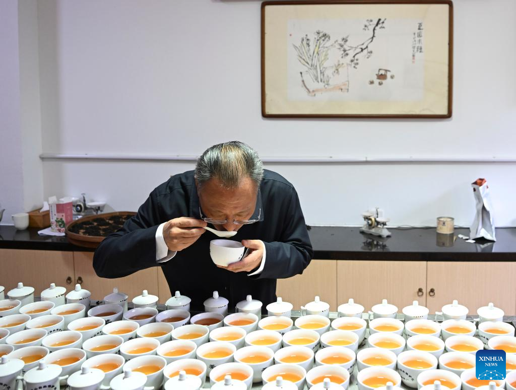 Imagen del 9 de mayo de 2025 del fundador de una cooperativa de té juzgando el té recién elaborado, en Wuyishan, en la provincia de Fujian, en el sureste de China. Wuyishan, una importante base productora de té en China, es el hogar del famoso té de roca Wuyi, un tipo de té oolong. Su técnica de elaboración del té fue declarada patrimonio cultural inmaterial nacional en 2006 y forma parte de las "técnicas tradicionales de elaboración del té y prácticas sociales asociadas en China" inscritas en 2022 como patrimonio cultural inmaterial de la UNESCO. (Xinhua/Jiang Kehong)
