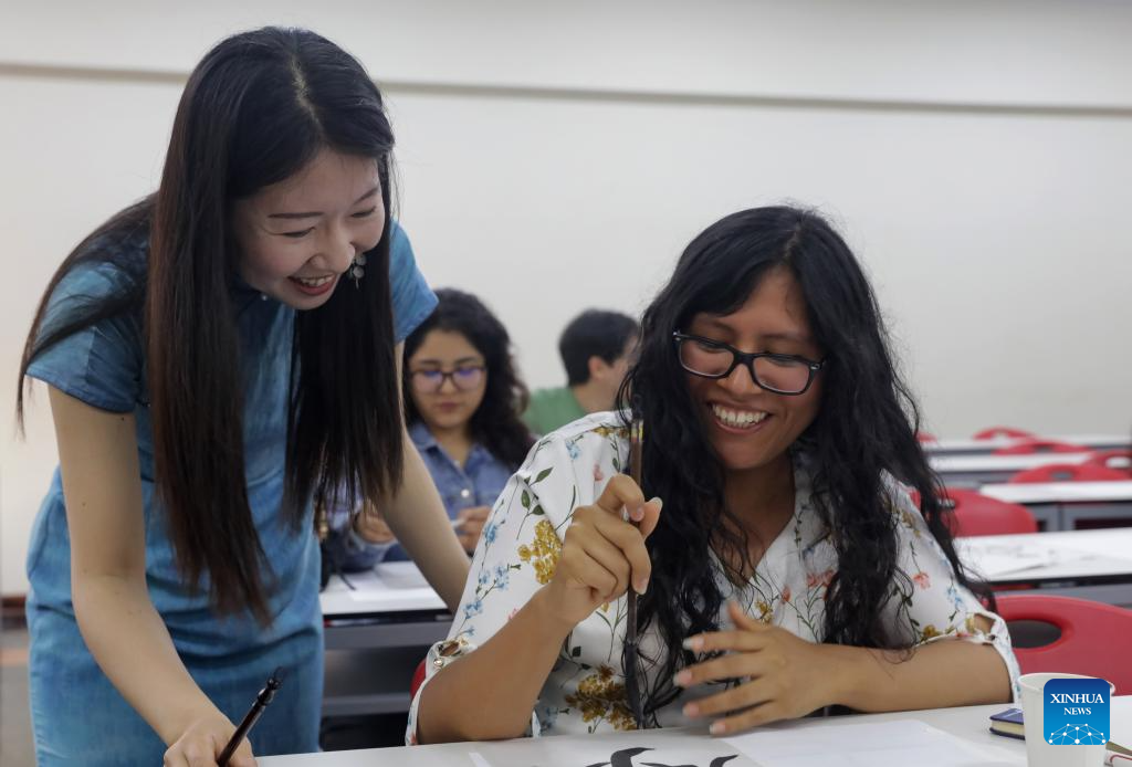 Imagen del 22 de abril de 2025 de la profesora de idioma chino, Liang Qing (i), del Instituto Confucio de la Pontificia Universidad Católica del Perú, instruyendo a una alumna peruana a escribir caligrafía china, en Lima, Perú. China aplicará una política de exención de visado a los ciudadanos de Brasil, Argentina, Chile, Perú y Uruguay, a modo de prueba, desde el 1 de junio de 2025 hasta el 31 de mayo de 2026, anunció el jueves pasado el Ministerio de Relaciones Exteriores chino. (Xinhua/Mariana Bazo)