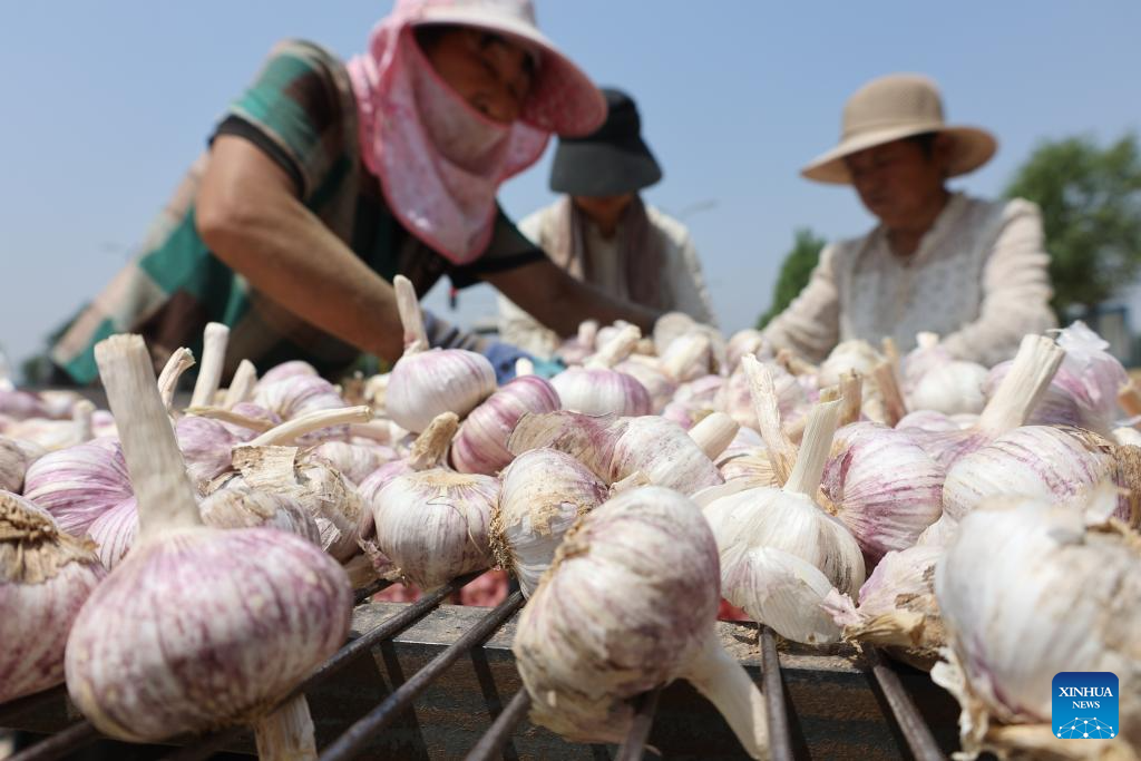 Agricultores clasifican y empacan ajo, en la ciudad de Kaifeng, en la provincia de Henan, en el centro de China, el 21 de mayo de 2025. El término solar tradicional chino Xiaoman (brotes de grano) cae el 21 de mayo de este año, lo que indica que las semillas de los granos están madurando. (Xinhua/Shi Fei)