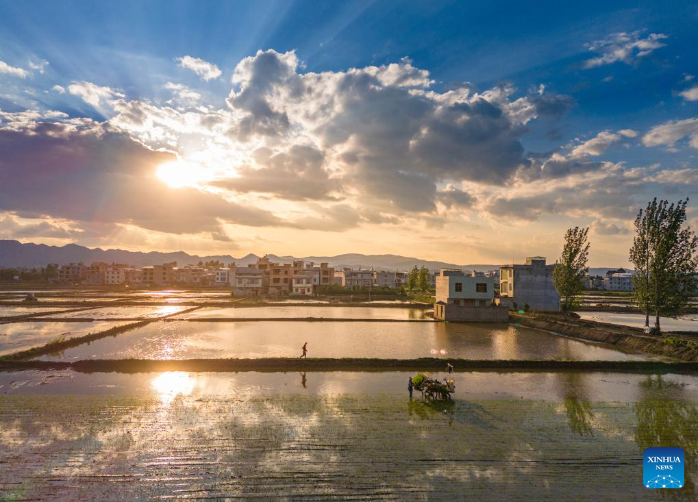 Agricultores trasplantan plántulas de arroz en los campos de arroz, en el distrito de Jinning de la ciudad de Kunming, en la provincia de Yunnan, en el suroeste de China, el 21 de mayo de 2025. El término solar tradicional chino Xiaoman (brotes de grano) cae el 21 de mayo de este año, lo que indica que las semillas de los granos están madurando. (Xinhua/Song Guangxu)