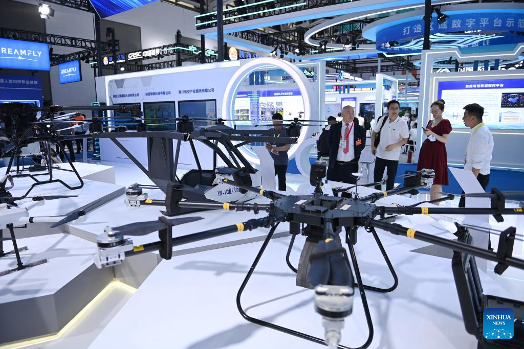 Visitantes se informan sobre productos aeronáuticos durante la Novena Exposición Internacional de la Ruta de la Seda y el Foro de Inversión y Comercio para la Cooperación entre el Este y el Oeste de China, en Xi'an, en la provincia de Shaanxi, en el noroeste de China, el 21 de mayo de 2025. El evento de cinco días de duración comenzó el miércoles en Xi'an. (Xinhua/Li Yibo)