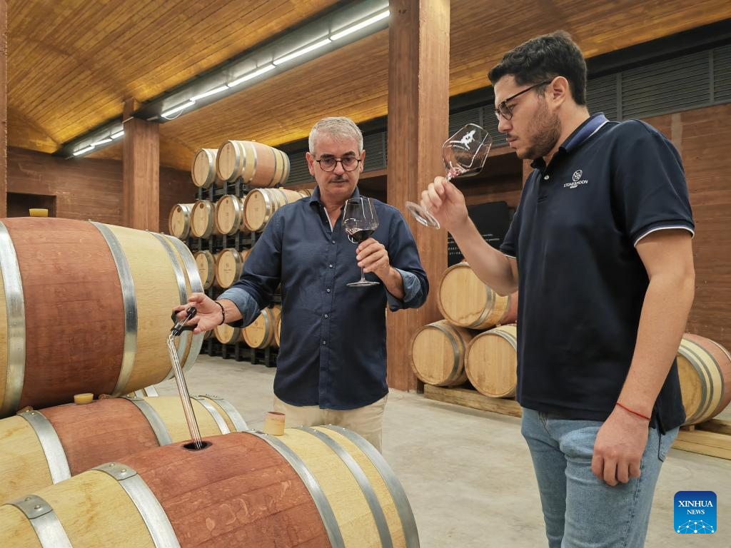 Imagen del 7 de agosto de 2024 de Nicolás Billot-Grima (i), cofundador de Stone and Moon Treasury Wine Estates, degustando vino con Federico Carabajal, vinicultor de Argentina, en una bodega, en la ciudad de Qingtongxia, en la región autónoma de la etnia hui de Ningxia, en el noroeste de China. China aplicará una política de exención de visado a los ciudadanos de Brasil, Argentina, Chile, Perú y Uruguay, a modo de prueba, desde el 1 de junio de 2025 hasta el 31 de mayo de 2026, anunció el jueves pasado el Ministerio de Relaciones Exteriores chino. (Xinhua/Liu Hai)