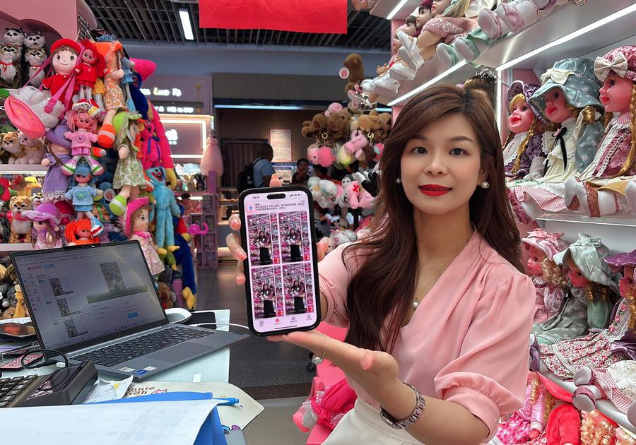 Sun Lijuan muestra videos de promoción en diferentes idiomas en su tienda en el Mercado Internacional de Yiwu en Yiwu, provincia oriental china de Zhejiang, 21 de mayo de 2025. [Xinhua]