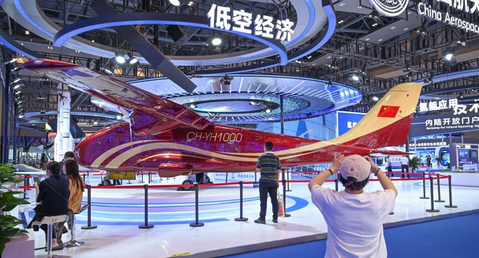 Imagen del 22 de mayo de 2025 de personas observando un vehículo aéreo no tripulado en la VII Feria Internacional de Inversión y Comercio del Oeste de China, en el municipio de Chongqing, en el suroeste de China. Varios productos relacionados con la economía de baja altitud atrajeron la atención de los visitantes en la feria. (Xinhua/Chen Cheng)