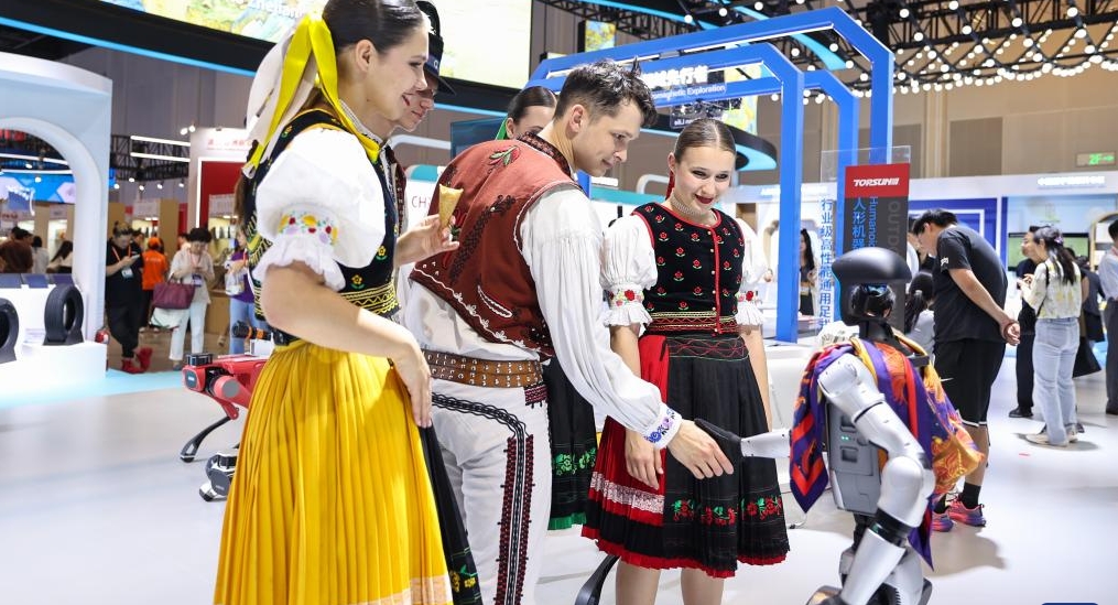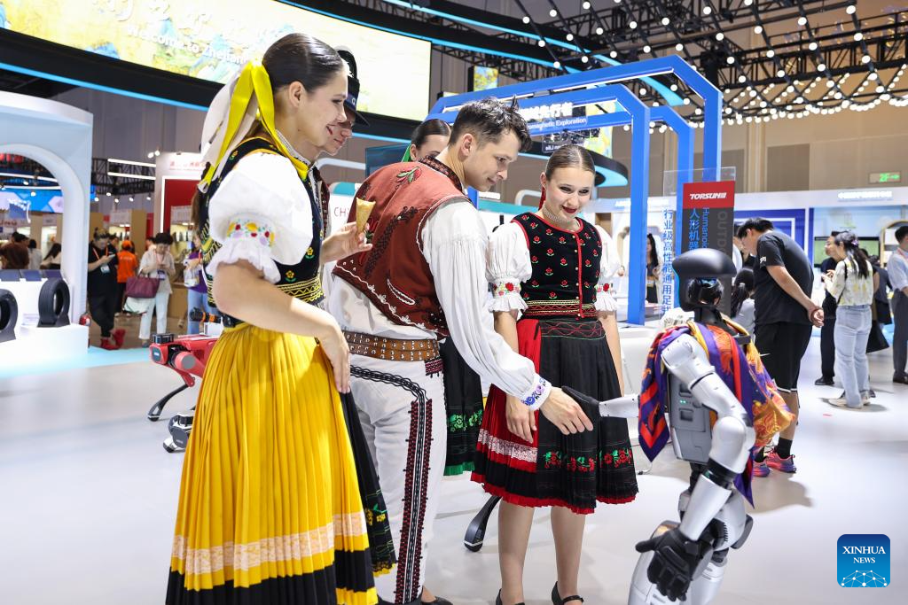 NINGBO, 23 mayo, 2025 (Xinhua) -- Imagen del 22 de mayo de 2025 de visitantes interactuando con un robot humanoide en la zona de exhibición de Fabricación Digital e Inteligente de los CEEC de la 4 Exposición China-CEEC y Feria Internacional de Bienes de Consumo, en Ningbo, en la provincia de Zhejiang, en el este de China. (Xinhua/Jiang Han)