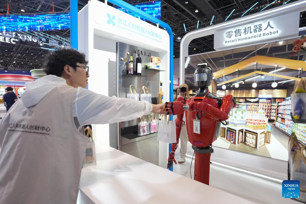 NINGBO, 23 mayo, 2025 (Xinhua) -- Imagen del 22 de mayo de 2025 de un robot humanoide minorista visto en la zona de exhibición de Fabricación Digital e Inteligente de los CEEC de la 4ª Exposición China-CEEC y Feria Internacional de Bienes de Consumo, en Ningbo, en la provincia de Zhejiang, en el este de China. (Xinhua/Huang Zongzhi)