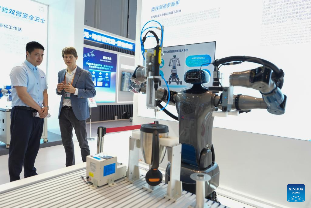 NINGBO, 23 mayo, 2025 (Xinhua) -- Imagen del 22 de mayo de 2025 de visitantes aprendiendo sobre un sistema robótico inteligente en la zona de exhibición de Fabricación Digital e Inteligente de los CEEC de la 4ª Exposición China-CEEC y Feria Internacional de Bienes de Consumo, en Ningbo, en la provincia de Zhejiang, en el este de China. (Xinhua/Huang Zongzhi)