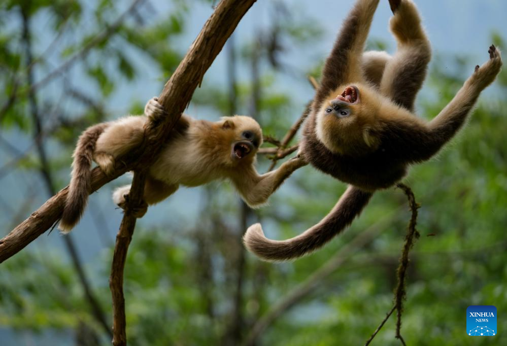 Monos dorados de nariz chata en la base de educación científica popular del mono dorado de nariz chata en el distrito de Pingwu, ciudad de Mianyang, provincia suroccidental china de Sichuan, el 21 de mayo de 2025. (Xinhua/Jiang Hongjing.)