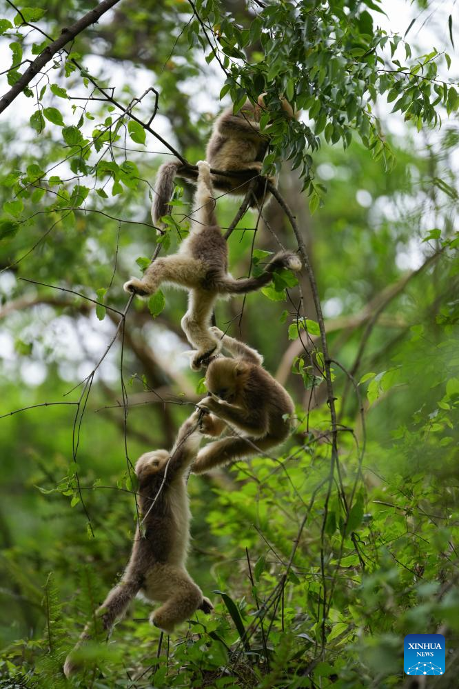 Monos dorados de nariz chata en la base de educación científica popular del mono dorado de nariz chata en el distrito de Pingwu, ciudad de Mianyang, provincia suroccidental china de Sichuan, el 21 de mayo de 2025. (Xinhua/Jiang Hongjing.)