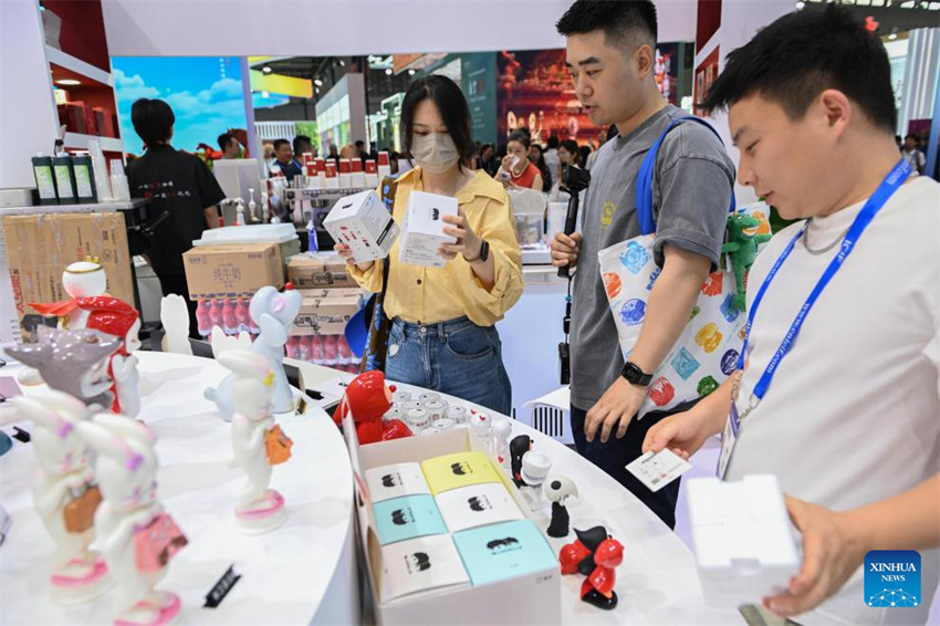 Visitantes seleccionan cajas sorpresa en la zona de exposición de Chongqing durante la 21.ª Feria Internacional de Industrias Culturales de China (Shenzhen), en la provincia meridional china de Guangdong, el 22 de mayo de 2025. (Xinhua/Xiao Ennan.)
