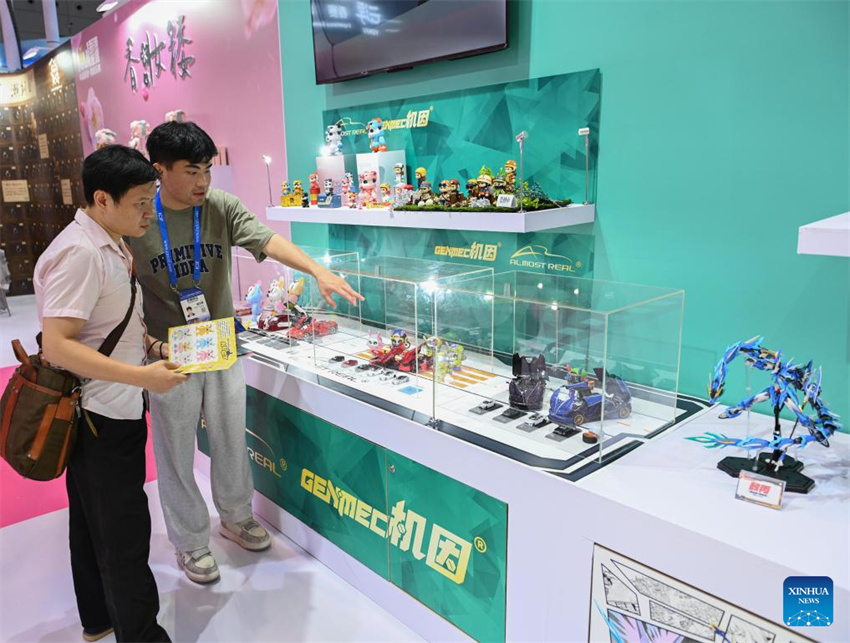 Un empleado presenta juguetes de moda a un visitante en la zona de exposición de Dongguan durante la 21.ª Feria Internacional de Industrias Culturales de China (Shenzhen), en la provincia meridional china de Guangdong, el 24 de mayo de 2025. En la actualidad, Dongguan produce más del 80 % de los juguetes de moda de China. En 2024, la ciudad albergaba 160 grandes empresas dedicadas a la producción de juguetes de moda, con unos ingresos totales de casi 23.800 millones de yuanes (unos 3.300 millones de dólares estadounidenses), un aumento interanual de casi el 19 %. (Xinhua/Xiao Ennan.)