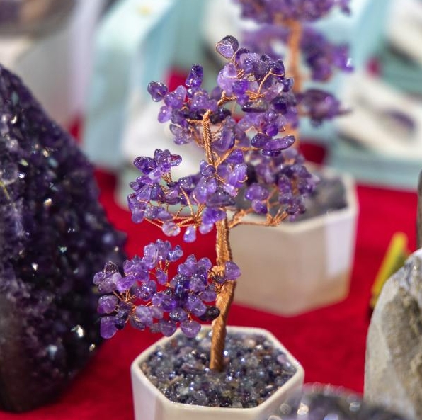 Imagen del 23 de mayo de 2025 de una visitante observando productos de piedras preciosas en el pabellón nacional de Uruguay durante la VII Feria Internacional de Inversión y Comercio del Oeste de China, en la municipalidad de Chongqing, en el suroeste de China. En la VII Feria Internacional de Inversión y Comercio del Oeste de China, que se está celebrando en Chongqing, en el suroeste de China, el pabellón nacional de Uruguay se ha convertido en un imán para la multitud con su impresionante exhibición de piedras preciosas de amatista de color violeta intenso, atrayendo a espectadores curiosos deseosos de saber más. (Xinhua/Huang Wei)