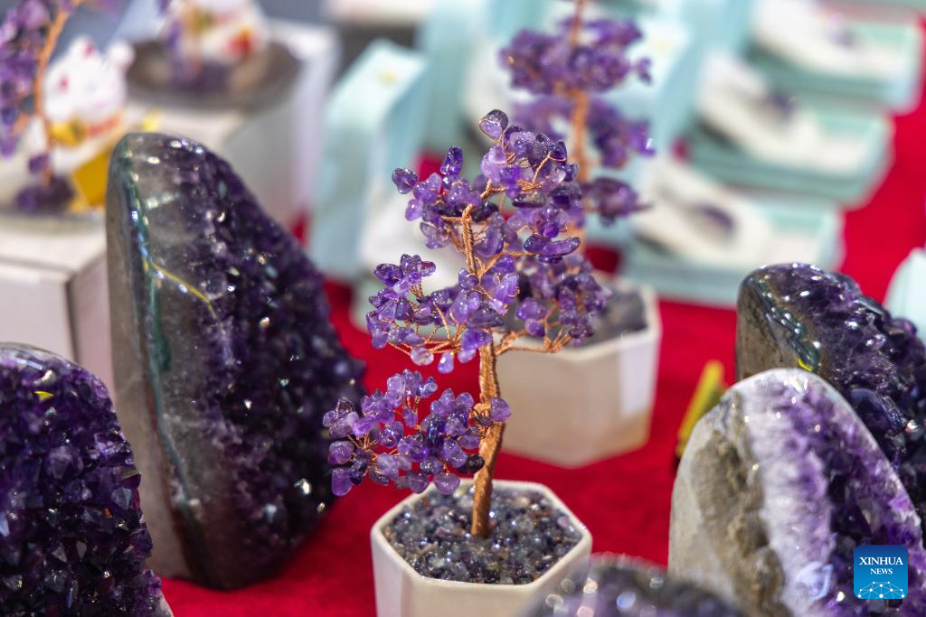 Imagen del 23 de mayo de 2025 de productos de piedras preciosas vistos en el pabellón nacional de Uruguay durante la VII Feria Internacional de Inversión y Comercio del Oeste de China, en la municipalidad de Chongqing, en el suroeste de China. En la VII Feria Internacional de Inversión y Comercio del Oeste de China, que se está celebrando en Chongqing, en el suroeste de China, el pabellón nacional de Uruguay se ha convertido en un imán para la multitud con su impresionante exhibición de piedras preciosas de amatista de color violeta intenso, atrayendo a espectadores curiosos deseosos de saber más. (Xinhua/Huang Wei)