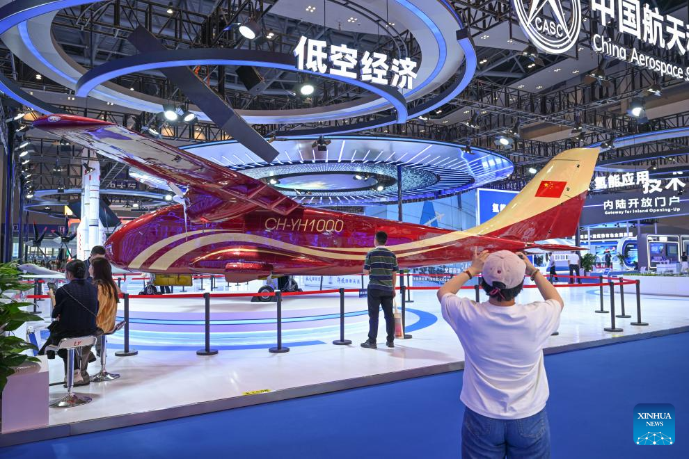 Imagen del 22 de mayo de 2025 de personas observando un vehículo aéreo no tripulado en la VII Feria Internacional de Inversión y Comercio del Oeste de China, en el municipio de Chongqing, en el suroeste de China. Varios productos relacionados con la economía de baja altitud atrajeron la atención de los visitantes en la feria. (Xinhua/Chen Cheng)