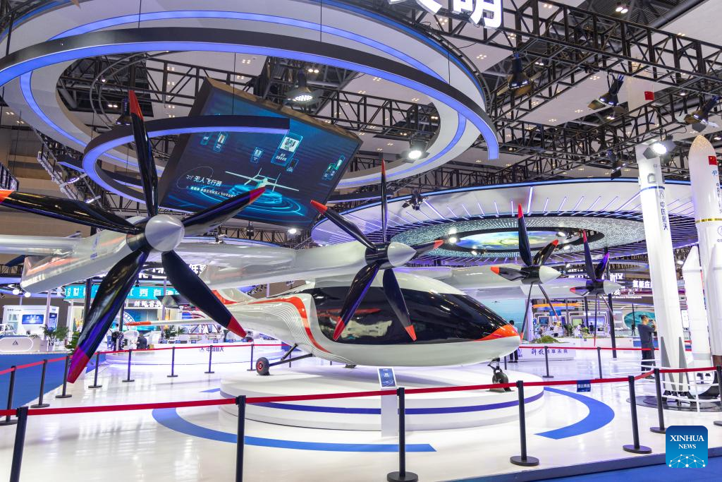 Un vehículo aéreo no tripulado es visto en la VII Feria Internacional de Inversión y Comercio del Oeste de China, en el municipio de Chongqing, en el suroeste de China, el 23 de mayo de 2025. Varios productos relacionados con la economía de baja altitud atrajeron la atención de los visitantes en la feria. (Xinhua/Chen Cheng)