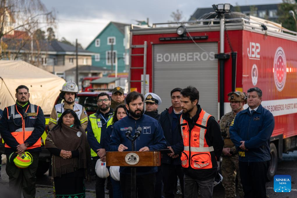 Imagen cedida por la Presidencia de Chile del presidente chileno, Gabriel Boric (c-frente), hablando durante una conferencia de prensa, en la ciudad de Puerto Varas, provincia de Llanquihue, en la Región de Los Lagos, en el sur de Chile. Boric viajó el lunes al municipio sureño de Puerto Varas, donde un inédito tornado dejó el domingo al menos 19 personas heridas y más de 250 viviendas con daños, además de postes eléctricos y árboles caídos. (Xinhua/Alex Ibañez/Presidencia de Chile)