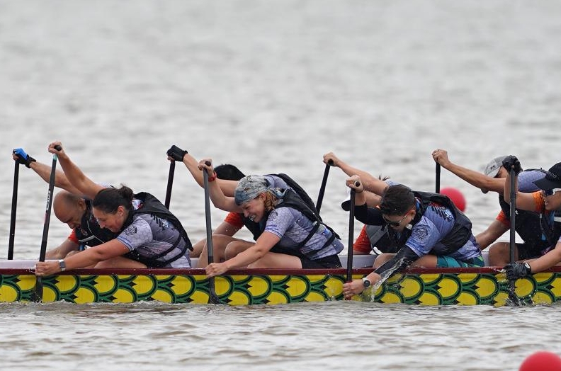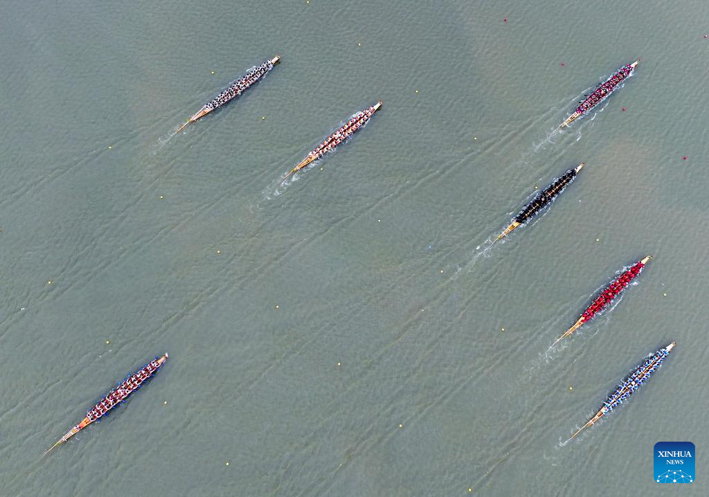 Vista aérea tomada con un dron de participantes compitiendo durante la carrera internacional de bote del dragón, en Nanchang, en la provincia de Jiangxi, en el este de China, el 23 de mayo de 2025. (Xinhua/Zhou Mi)