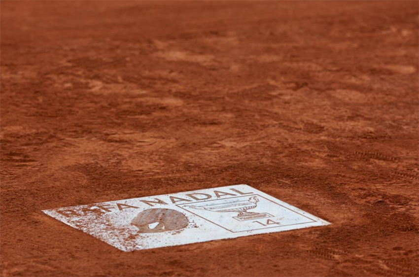 Imagen del 25 de mayo de 2025 de una placa con la huella del ex tenista español, Rafael Nadal en honor a su carrera, durante el torneo de tenis Abierto de Francia, en la Cancha Philippe Chatrier, en Roland Garros, en París, Francia. (Xinhua/Li Jing)