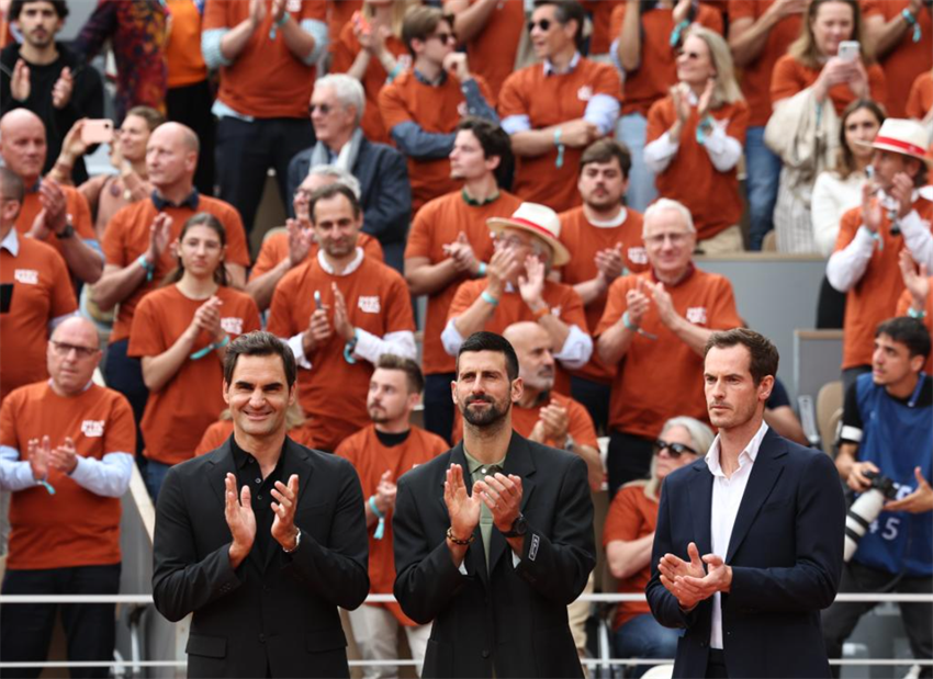 (De izq. a der.) Imagen del 25 de mayo de 2025 de Roger Federer, Novak Djokovic y Andy Murray, asistiendo a una ceremonia llevada a cabo para honrar la carrera del ex tenista español, Rafael Nadal, durante el torneo de tenis Abierto de Francia, en la Cancha Philippe Chatrier, en Roland Garros, en París, Francia. (Xinhua/Li Jing)