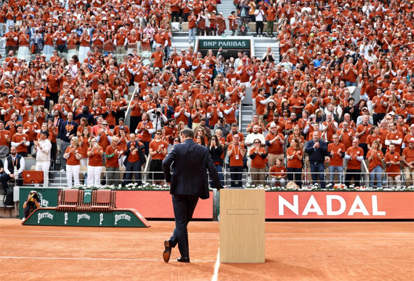 Imagen del 25 de mayo de 2025 del ex tenista español, Rafael Nadal, reaccionando durante una ceremonia para honrar su carrera, durante el torneo de tenis Abierto de Francia, en la Cancha Philippe Chatrier, en Roland Garros, en París, Francia. (Xinhua/Li Jing)