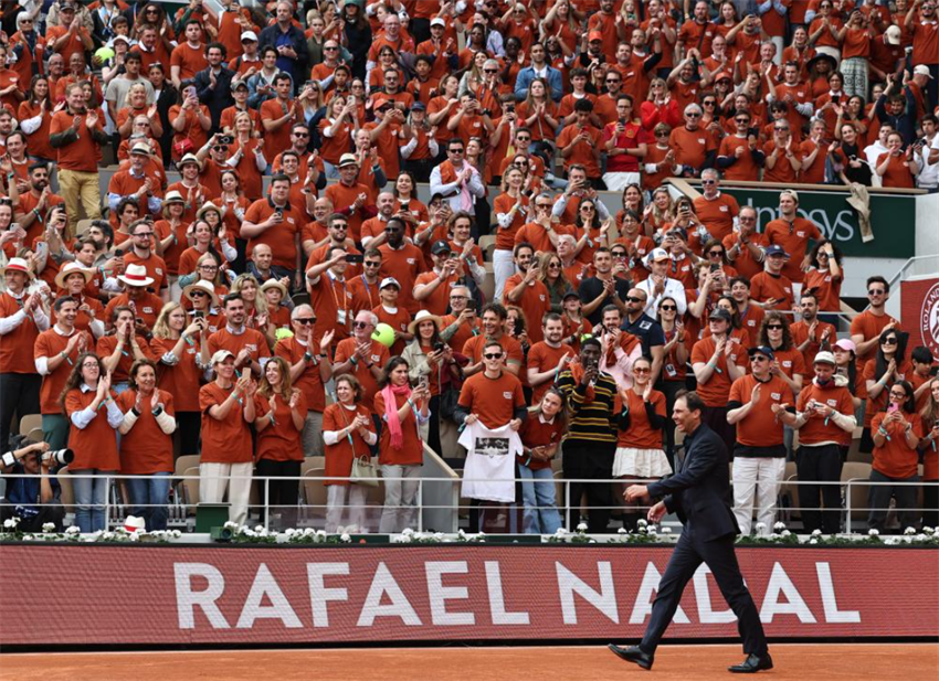 Imagen del 25 de mayo de 2025 del ex tenista español, Rafael Nadal, reaccionando durante una ceremonia para honrar su carrera, durante el torneo de tenis Abierto de Francia, en la Cancha Philippe Chatrier, en Roland Garros, en París, Francia. (Xinhua/Li Jing)