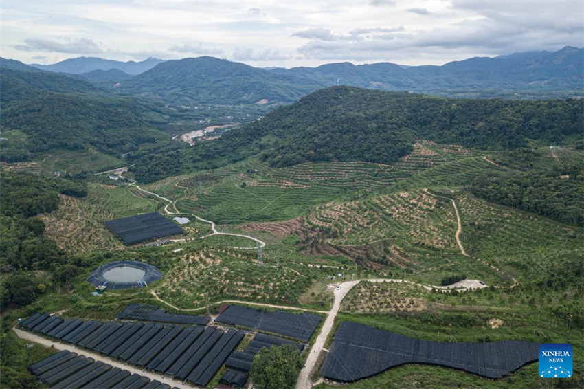 Una foto aérea tomada por un dron el 24 de mayo de 2025 muestra un parque industrial de durianes en el distrito autónomo de las etnias li y miao de Baoting, en la provincia meridional china de Hainan. (Xinhua/Pu Xiaoxu.)